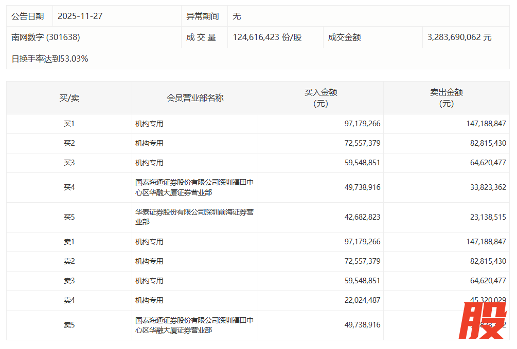 南网数字:全天换手率达53.03%,4机构合计净卖出8863.48万元南网数字:全天换手率达53.03%,4机构合计净卖出8863.48万元
