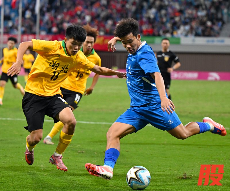 新华社照片,深圳(广东),2025年11月12日\n 11月12日,湖北队球员杨希(前左)和广东队球员李明杰在比赛中拼抢。\n 当日,在广东深圳举行的第十五届全国运动会足球项目男子20岁以下组金牌赛中,湖北队与广东队在常规时间和加时赛1比1战平,最终通过点球大战,湖北队以6比4的总比分战胜广东队,夺得冠军。\n 新华社记者 郝源 摄
