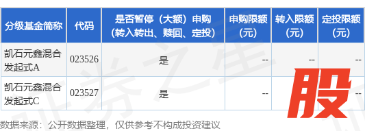 本站消息,11月11日凯石基金管理有限公司发布《凯石元鑫混合型发起式证券投资基金基金暂停(大额)申购(转换转入、赎回、转换转出、定期定额投资)公告》。公告中提示,为保护基金份额持有人的利益,保持基金的平稳运行,自2025年11月11日起凯石元鑫混合型发起式证券投资基金基金暂停(大额)申购(转换转入、赎回、转换转出、定期定额投资),申购、转换转入上限金额为1.0亿元,下属分级基金调整明细如下: